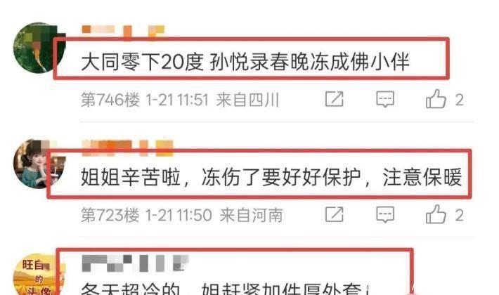 1月21号那天,孙悦在微博上发了几张照片,她站在山西大同的城墙边,脸冻得通红,口罩也挡不住那份疲惫,她说自己“冻成佛小伴”,这话听起来轻松,但网友一看就知道她真的受罪了,当天大同气温零下23度,风一吹,感觉更冷,录制现场连个遮风的地方都没有。