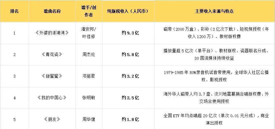 第1首,潘安邦叶佳修《外婆的澎湖湾》,收入9.3亿恐怕没人能想到,排行榜榜首的,居然是《外婆的澎湖湾》。